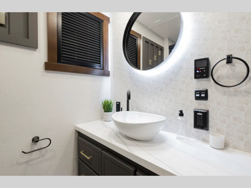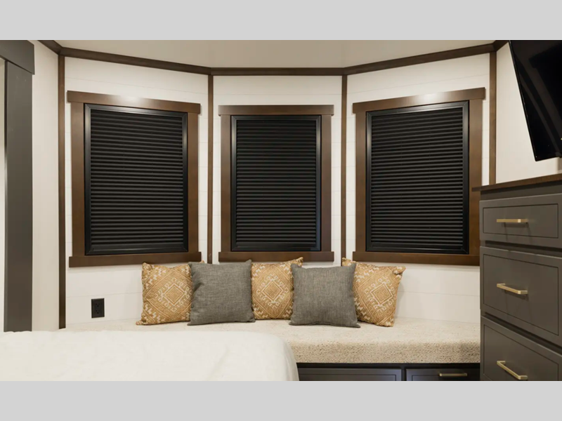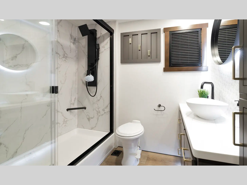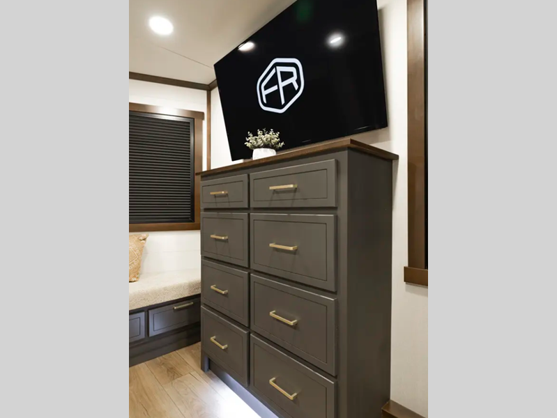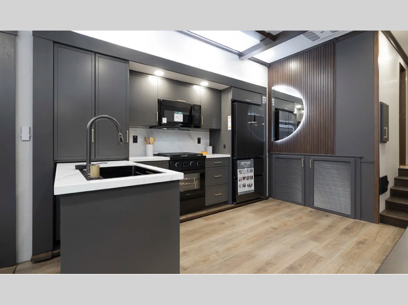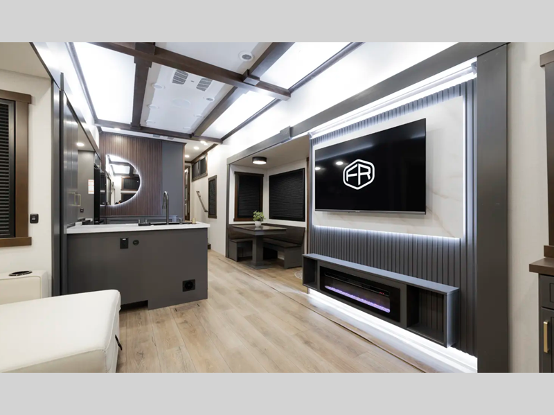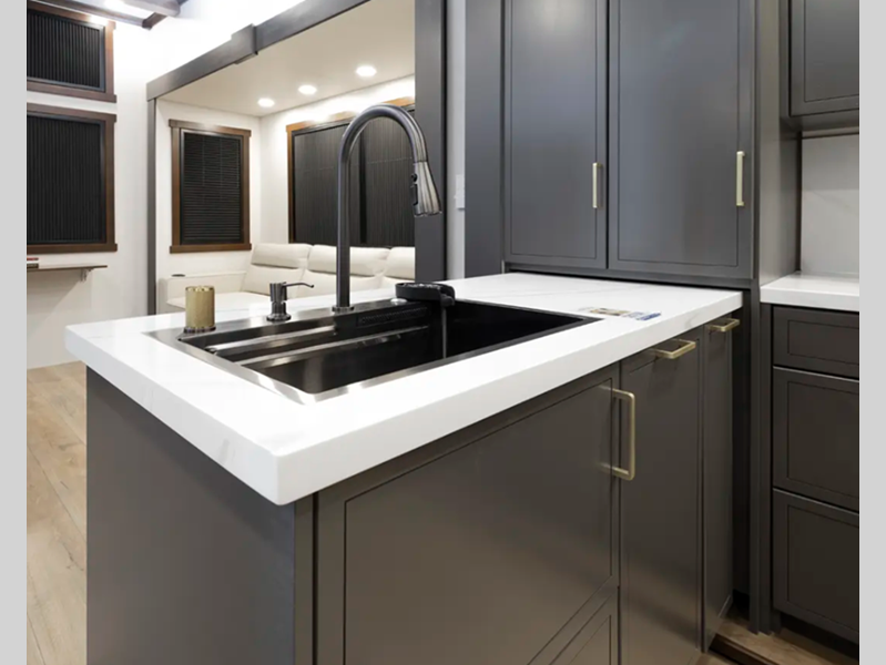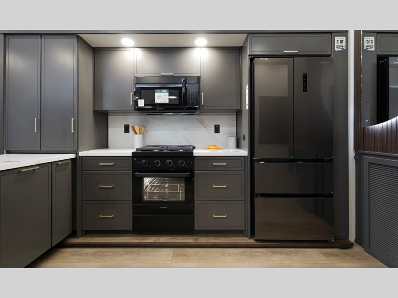 The 101" wide body frame provides a rock-solid base for your adventures, while the AlphaPly TPO roof membrane offers uncompromising durability and weather protection. Inside, the residential-style dovetail design gives a sleek, modern aesthetic, complemented by self-closing drawers and hidden hinge cabinet doors that exude refined elegance. Plus, the vinyl floor covering is effortlessly easy to clean and maintain.