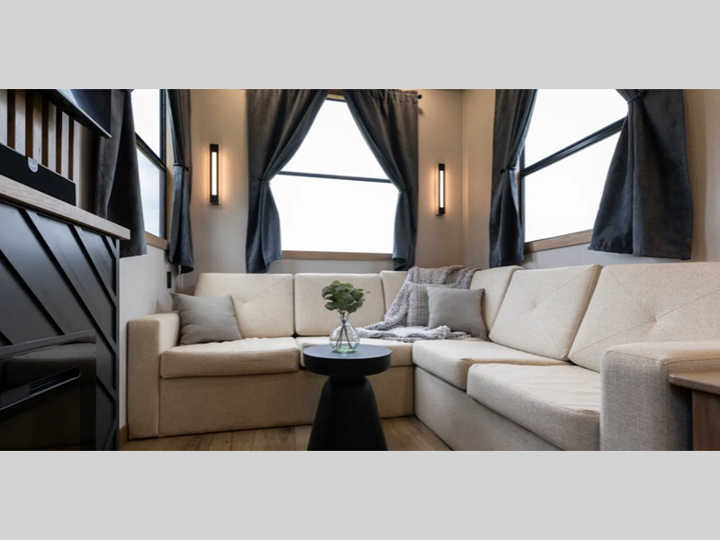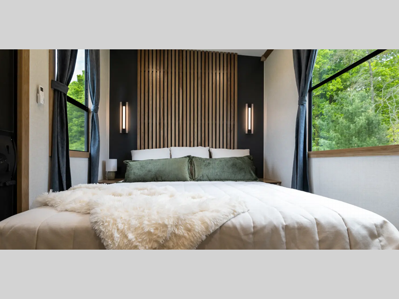 Each destination trailer is built with Azdel Onboard composite sidewall panels for superior insulation, lighter weight, and lasting durability. There are also dual pane windows, a durable rolled fiberglass roof, and stylish full-body paint. The hardwood cabinetry inside is sure to make you feel at home, along with luxury vinyl flooring, a 10" thick memory foam mattress, and residential appliances.