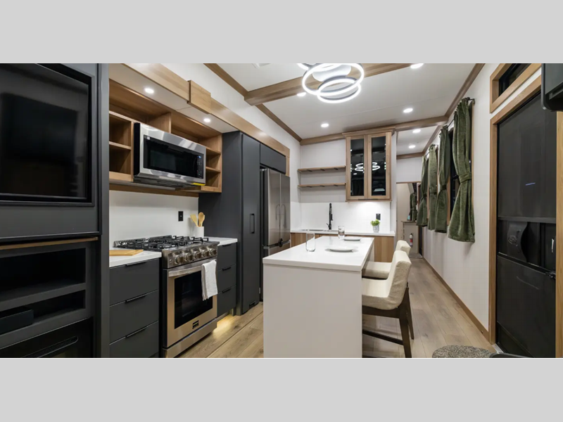Sleeps 4 Length 44 ft 1 in Ext Width 8 ft 6 in Ext Height 13 ft 6 in Hitch Weight 1430 lbs GVWR 14486 lbs Dry Weight 12486 lbs Cargo Capacity 2000 lbs Fresh Water Capacity 79 gals Grey Water Capacity 80 gals Black Water Capacity 40 gals Tire Size 17.5" Furnace BTU 40000 btu Available Beds Queen Refrigerator Type Samsung French Door w/Ice Maker Refrigerator Size 18 cu ft Cooktop Burners 4 LP Tank Capacity 40 lbs Water Heater Type Truma On Demand AC BTU 30000 btu TV Info LR 50" Smart LED TV, BR 40" Smart LED TV Washer/Dryer Available Yes Number of LP Tanks 2 Shower Type Standard Similar Floorplans