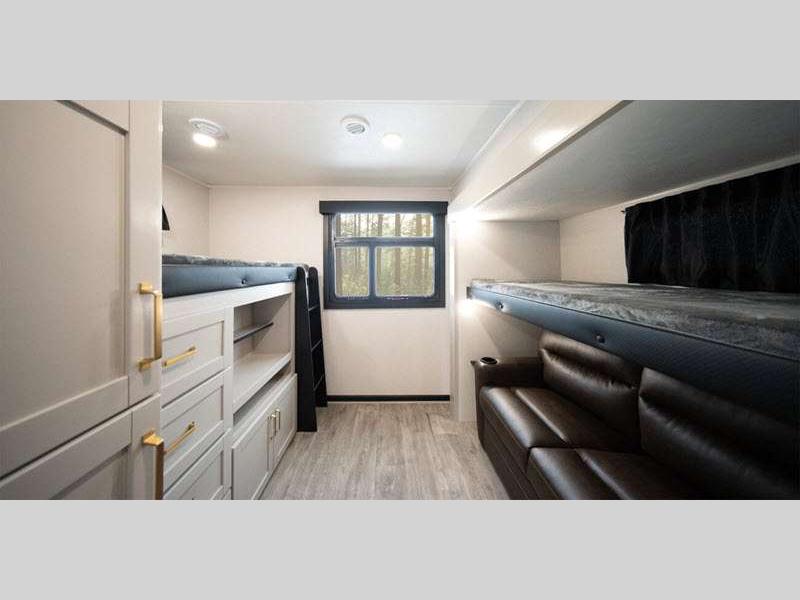 Sleeps 8 Slides 3 Length 38 ft 9 in Ext Width 8 ft 1 in Ext Height 11 ft 10 in Int Height 7 ft Interior Color Dune Gray Hitch Weight 1140 lbs GVWR 11995 lbs Dry Weight 9845 lbs Cargo Capacity 1705 lbs Fresh Water Capacity 52 gals Grey Water Capacity 74 gals Black Water Capacity 37 gals Furnace BTU 35000 btu Number Of Bunks 2 Available Beds Olympic Refrigerator Type 12V Refrigerator Size 10 cu ft Cooktop Burners 3 Shower Size 30" x 36" Number of Awnings 1 LP Tank Capacity 30 Lbs. Water Heater Type On Demand Tankless AC BTU 15000 btu TV Info 4K Ultra LED HD Smart TV Awning Info 14' Electric Axle Count 2 Number of LP Tanks 2 Shower Type Standard Electrical Service 50 amp Solar Wattage 200 watts Similar Floorplans