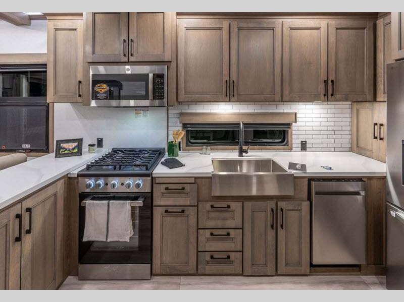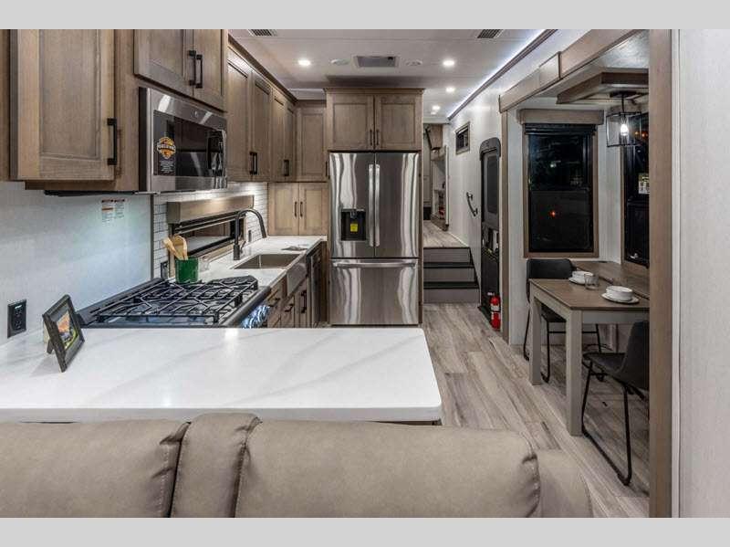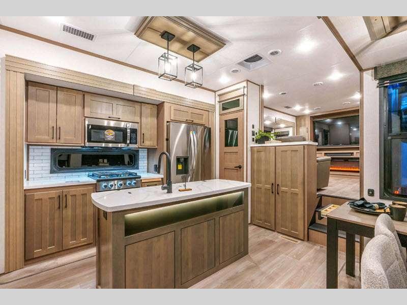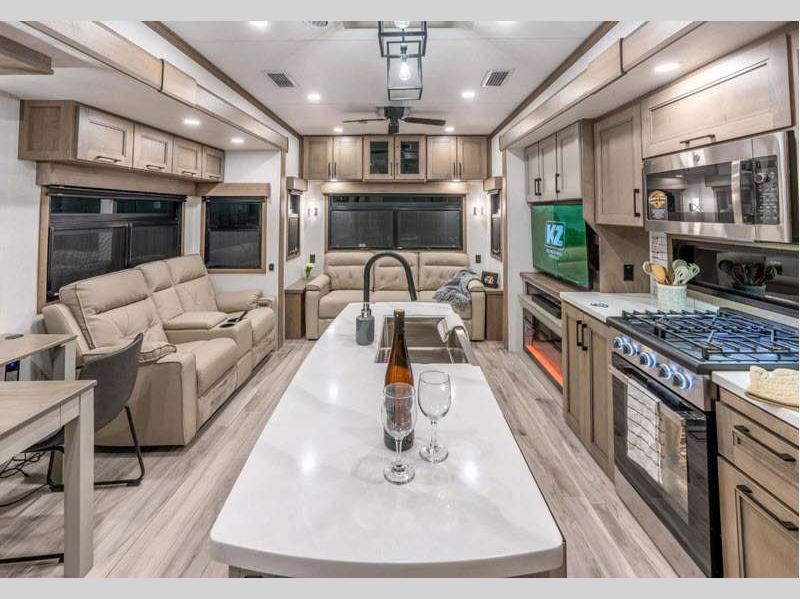 Each fifth wheel is built with 101" wide-body construction, an extra-reinforced heavy-duty front fiberglass cap, and features the All-Weather Insulation Package so you can enjoy camping in all kinds of weather. The six-point hydraulic auto-leveling makes setting up easier, and the KZ Engage Powered by OneControl features an app that you can download to control all of your unit's functions right from your smartphone. The Durango Gold's kitchen is a chef's dream with its 26-cu. ft. house refrigerator with a 2,000W inverter, 30" convection microwave, 24" oven with four-burner range, plus abundant storage!