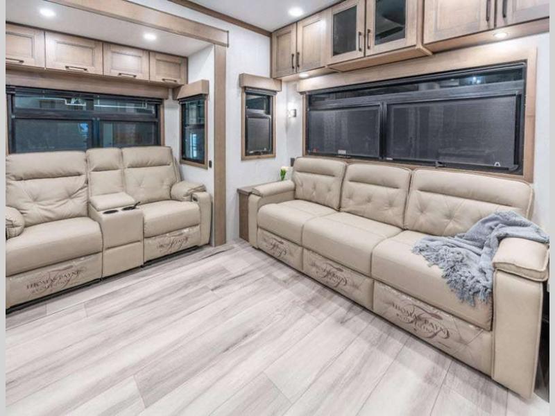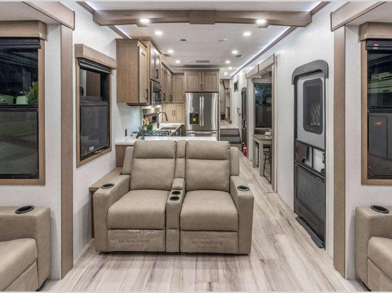 Sleeps 6 Slides 5 Length 42 ft 5 in Ext Width 8 ft 5 in Ext Height 13 ft 6 in Int Height 6 ft 8 in Interior Color Mink, Pebble, Blancher Maple/Morel Fog Exterior Color Black Pearl Full Body Paint Option, Grey Pearl Full Body Option Hitch Weight 2750 lbs GVWR 16400 lbs Dry Weight 14160 lbs Cargo Capacity 2240 lbs Fresh Water Capacity 76 gals Grey Water Capacity 90 gals Black Water Capacity 50 gals Tire Size 17.5" Furnace BTU 40000 btu Available Beds King Refrigerator Type House Refrigerator with 2000W Inverter Refrigerator Size 26 cu ft Convection Cooking Yes Cooktop Burners 4 Shower Size 48" x 30" Number of Awnings 1 Axle Weight 11410 lbs LP Tank Capacity 30 lbs Water Heater Type On Demand Tankless AC BTU 45000 btu TV Info LR LED TV, BR 32" Smart LED TV Awning Info 18' Power w/Fusion LED Light Strip Axle Count 2 Washer/Dryer Available Yes Number of LP Tanks 2 Shower Type Shower w/Seat Electrical Service 50 amp Solar Wattage 400 watts Similar Floorplans