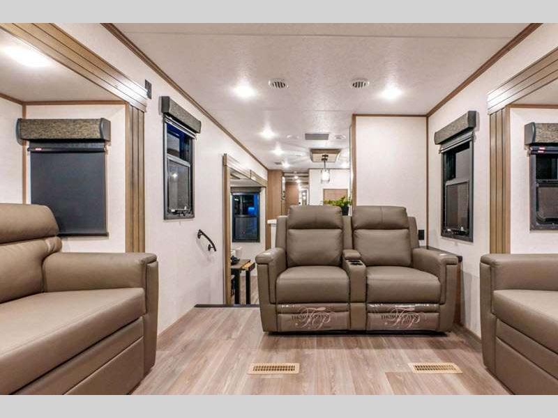 Sleeps 6 Slides 5 Length 42 ft 5 in Ext Width 8 ft 5 in Ext Height 13 ft 6 in Int Height 6 ft 8 in Interior Color Mink, Pebble, Blancher Maple/Morel Fog Exterior Color Black Pearl Full Body Paint Option, Grey Pearl Full Body Option Hitch Weight 2860 lbs GVWR 17795 lbs Dry Weight 15430 lbs Cargo Capacity 2365 lbs Fresh Water Capacity 76 gals Grey Water Capacity 90 gals Black Water Capacity 50 gals Tire Size 17.5" Furnace BTU 40000 btu Number Of Bunks 1 Available Beds King Refrigerator Type House Refrigerator with 2000W Inverter Refrigerator Size 26 cu ft Convection Cooking Yes Cooktop Burners 4 Shower Size 48" x 30" Number of Awnings 1 Axle Weight 12570 lbs LP Tank Capacity 30 lbs Water Heater Type On Demand Tankless AC BTU 45000 btu TV Info LR 50" Smart LED TV, BR 32" Smart LED TV Awning Info 20' Power w/Fusion LED Light Strip Axle Count 2 Washer/Dryer Available Yes Number of LP Tanks 2 Shower Type Shower w/Seat Electrical Service 50 amp Solar Wattage 400 watts Similar Floorplans