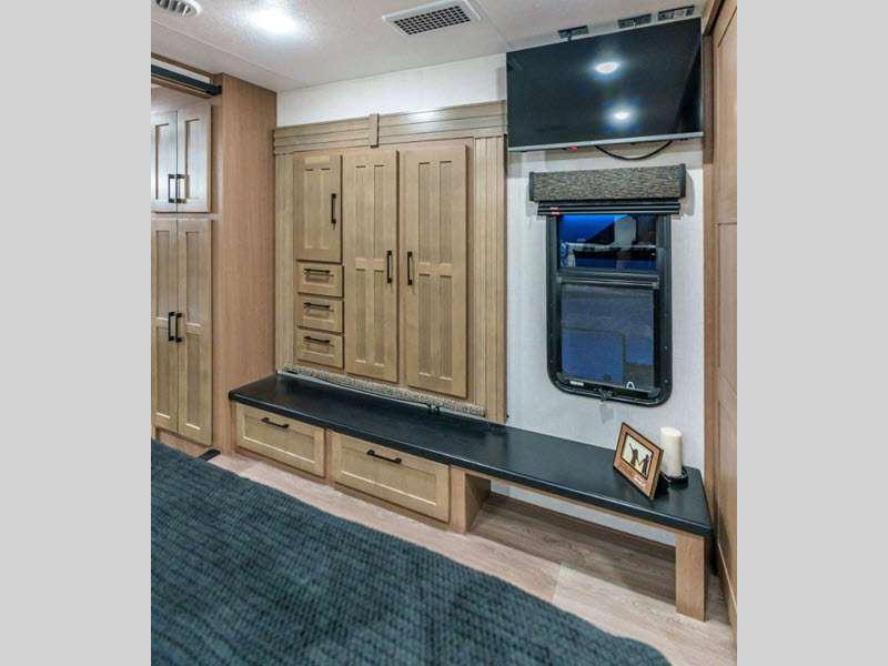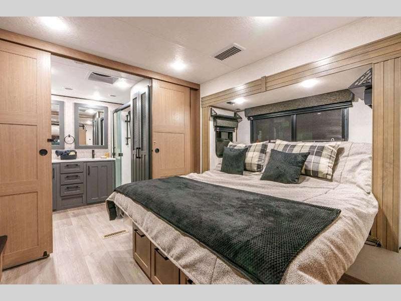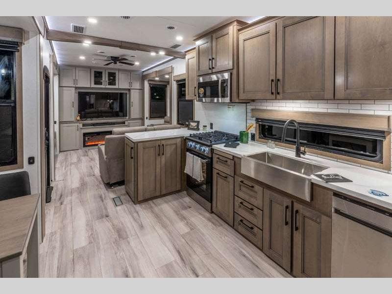 Sleeps 4 Slides 4 Length 34 ft 11 in Ext Width 8 ft 5 in Ext Height 13 ft 6 in Int Height 6 ft 8 in Interior Color Mink, Pebble, Blancher Maple/Morel Fog Exterior Color Black Pearl Full Body Paint Option, Grey Pearl Full Body Option Hitch Weight 2640 lbs GVWR 14995 lbs Dry Weight 12740 lbs Cargo Capacity 2255 lbs Fresh Water Capacity 76 gals Grey Water Capacity 90 gals Black Water Capacity 50 gals Tire Size 17.5" Furnace BTU 40000 btu Available Beds King Refrigerator Type House Refrigerator with 2000W Inverter Refrigerator Size 26 cu ft Convection Cooking Yes Cooktop Burners 4 Shower Size 48" x 30" Number of Awnings 1 Axle Weight 10100 lbs LP Tank Capacity 30 lbs Water Heater Type On Demand Tankless AC BTU 45000 btu TV Info LR 50" Smart LED TV, BR 32" Smart LED TV Awning Info 17' Power w/Fusion LED Light Strip Axle Count 2 Washer/Dryer Available Yes Number of LP Tanks 2 Shower Type Shower w/Seat Electrical Service 50 amp Solar Wattage 400 watts Similar Floorplans