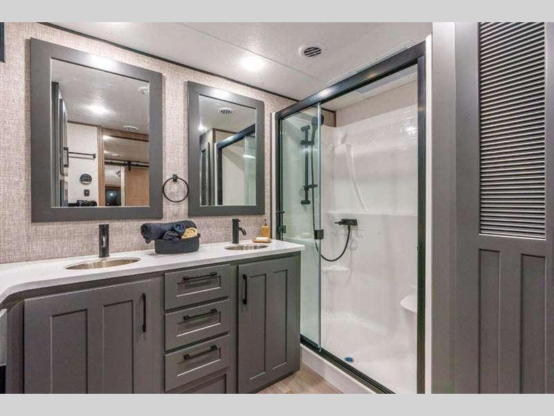 KZ Durango Gold fifth wheel G384MSQ highlights: Rear Living Dual Entry Bathroom ... more about Durango Gold G384MSQ