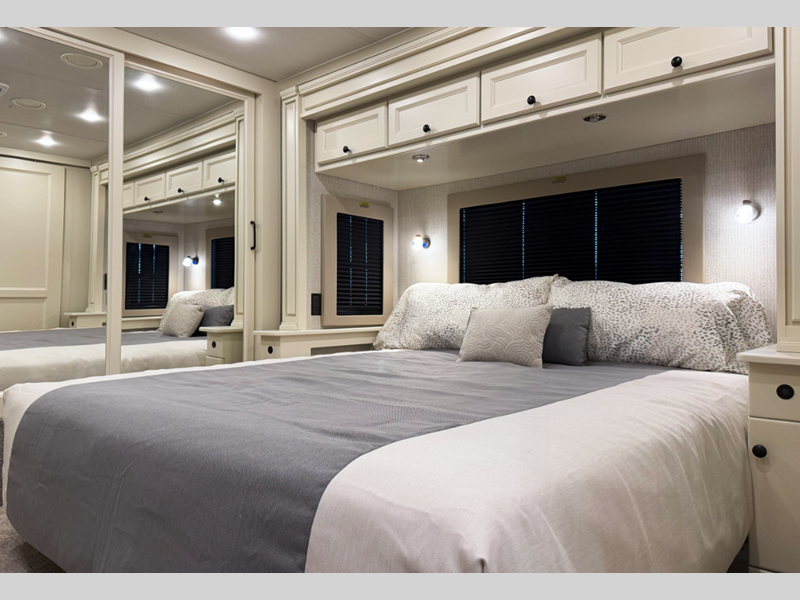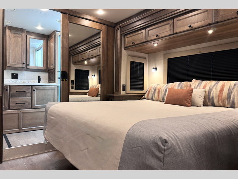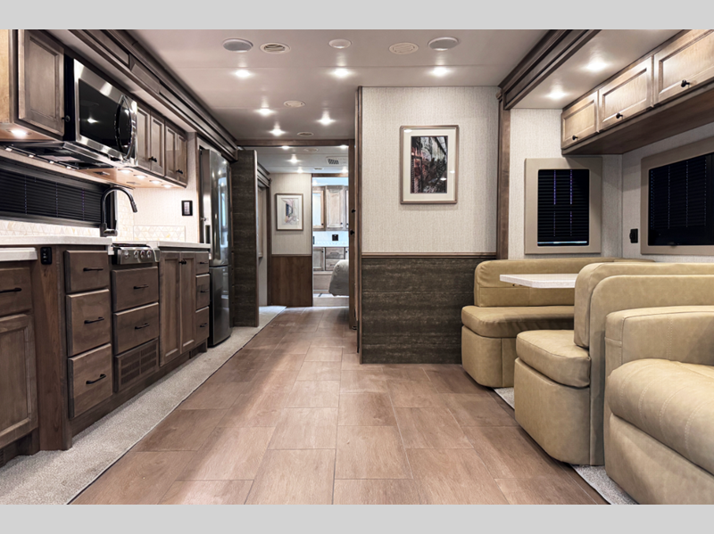 The full-body paint with three layers of clear coat help protect your unit as you head down the highway, and the White Sands Lifestyle Leather seats are sure to bring comfort. You will also appreciate the color backup camera and side view cameras for easy parking, along with hydraulic leveling jacks with a control panel to have you set up in no-time. You will be met with luxury features inside, including handcrafted cabinetry, solid surface countertops, a memory foam mattress, and dimmable LED lighting.