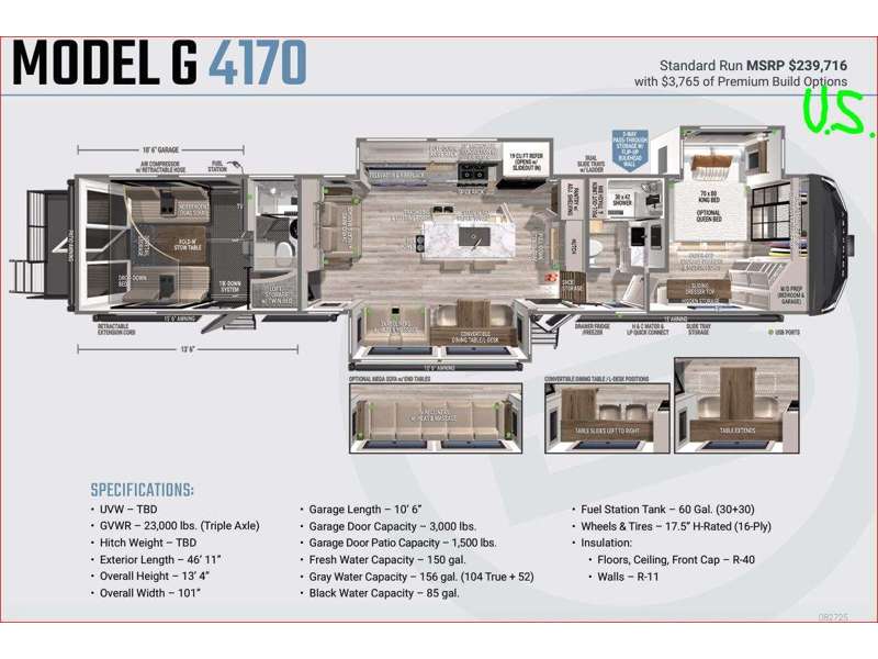 With any Model G toy hauler fifth wheel by Brinkley you will enjoy luxurious amenities, tons of storage space, and innovative features that have been developed and tested in the real world. Durable construction includes an industry leading PDI process, an industry best insulation package, and reinforced and walkable slide roofs. Some of the exterior features you'll find are a 3-way pass-through with a multi-functional flip-up bulkhead wall, under I-beam storage, a MAX-Vision reverse lighting system, and a low-maintenance roof to name a few. A Rockford Fosgate audio system comes standard, along with a OneControl app system that lets you control your fifth wheel's functions right from your mobile device. You will find the solar system with a designated storage area to be ultra convenient, plus there is a FlexPower 5500 with a dual fuel inverter generator for all your power needs. Head inside to find a residential interior with Brinkley's CraftSense wood trim construction, floating entrance steps, integrated window screens and insulated blackout blinds, and residential solid surface countertops plus backsplash. You will also enjoy the neon shower lighting and recessed medicine cabinets in the bath, plus motion activated LED bed lights and dual bedside outlets in the bedroom. Choose a Model G toy hauler fifth wheel to experience all the luxury it has to offer!