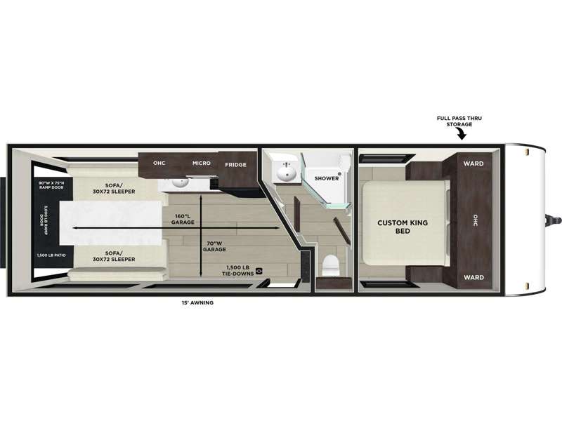 The 260RTK front bedroom provides a queen bed with extra storage, while the adjacent bathroom gives you a large skylight shower and mirrored linen closet. The kitchen provides modern appliances, panoramic window, and a faux stone accent wall with entertainment center. Taking the crew on the road? The flip-down sofas and removable dining table in the garage convert to a king bed. Plus, the ramp door doubles as a party patio. At just over 5000 lb, this toy hauler is ready to roll and easy to tow.