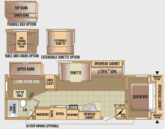 Jay Flight G2 TT w/Double Slide, Rear Bunkhouse w/Slide Out J-Cube Futon Sofa w/Bunk Above or Opt. Trundle Bed Slide Out w/Bunk, Rear Bathroom w/Toilet, Tub/Shower, Lav., Med. Cab., Wardrobe, Pantry, Refrigerator, 3 Burner Range, Microwave, Double Kitchen Sink, Overhead Cab., Slide Out Booth Dinette & J-Steel Sofa or Opt. Free Standing Dinette or Ext. Dinette, Overhead Cabinet, Ward., TV Cab. w/22" LCD TV, Front Queen Bed, Dbl. Chest, Opt. Wardrobe, TV Shelf, 20' Awning Opt. and More.