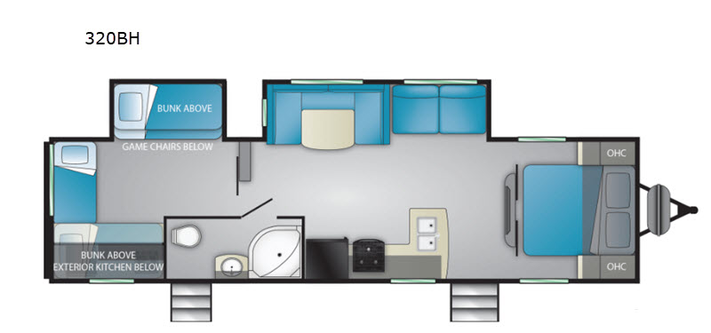 Camping at your local state park has never been more fun or easy than with this Prowler travel trailer. The kids will love having their own space in the private bunkhouse, and mom and dad will appreciate the front private bedroom. The bunkhouse includes three bunks and game chairs below one bunk so that the kids can read books or play on their tablets, and the front bedroom includes a queen bed for complete comfort. This model has two entry doors, one leading into the main living area and another leading into the full bath for convenience. You'll find plenty of seating options on the sofa or around the U-shaped dinette, and the chef will have their choice to cook indoors or outdoors on the exterior kitchen!